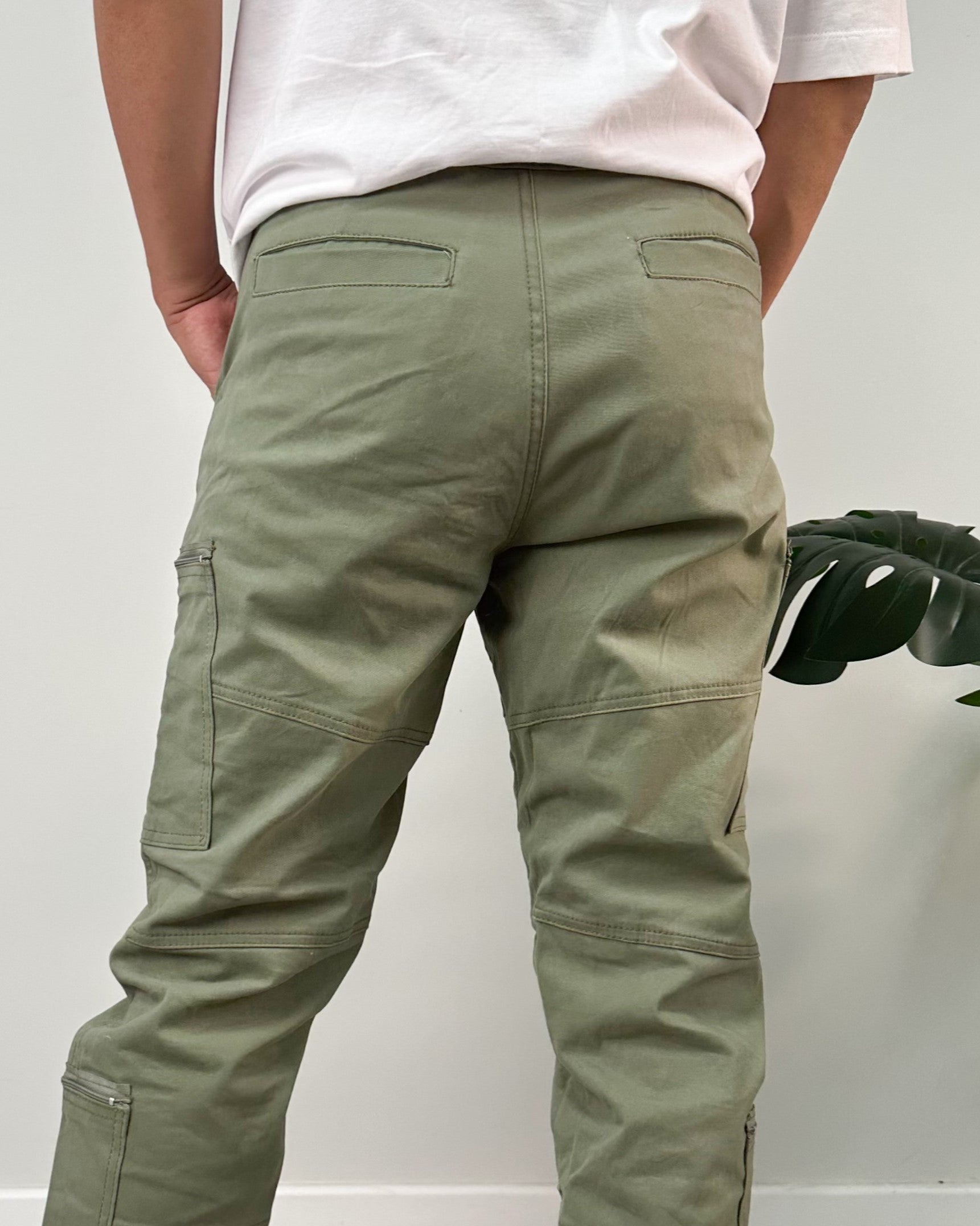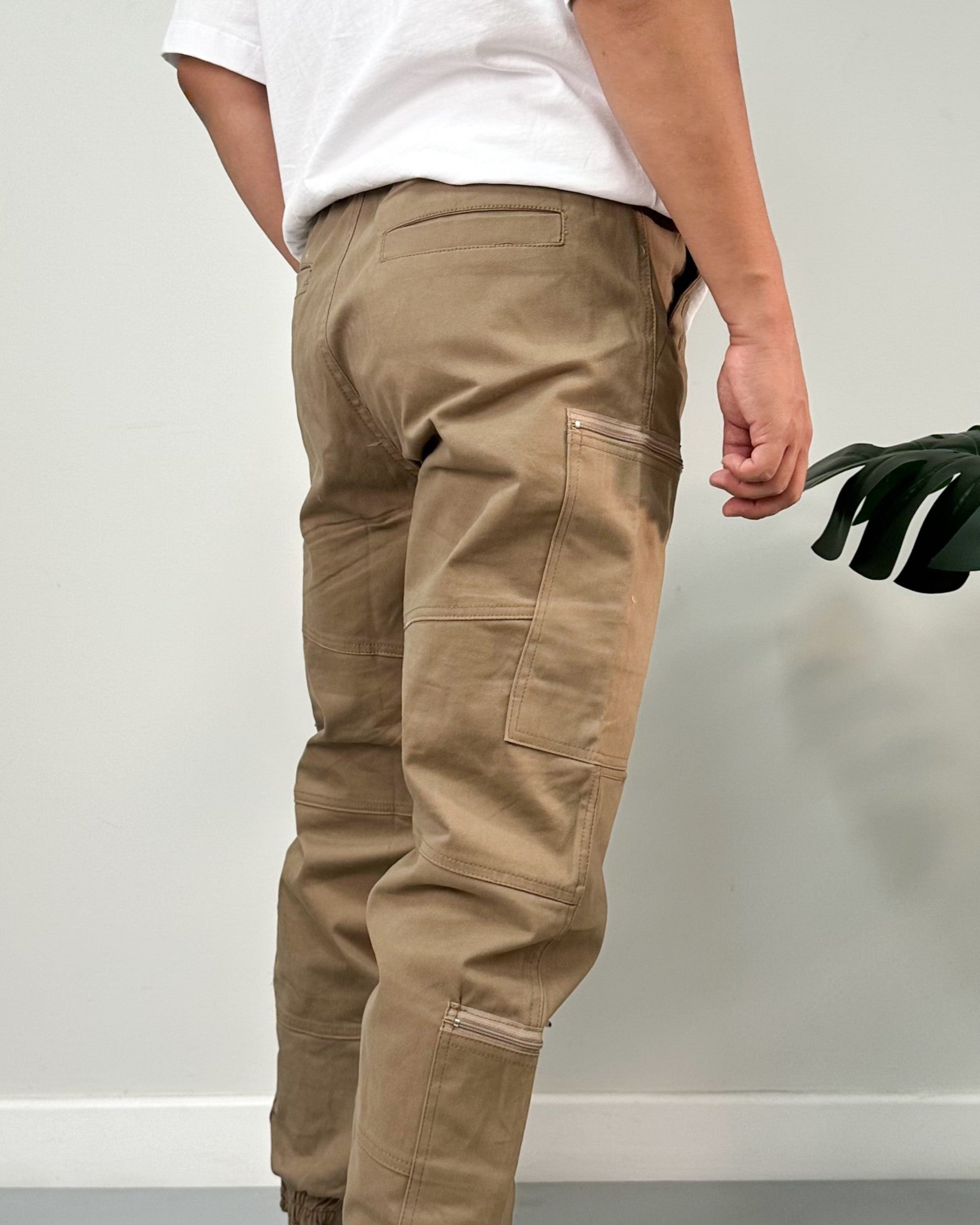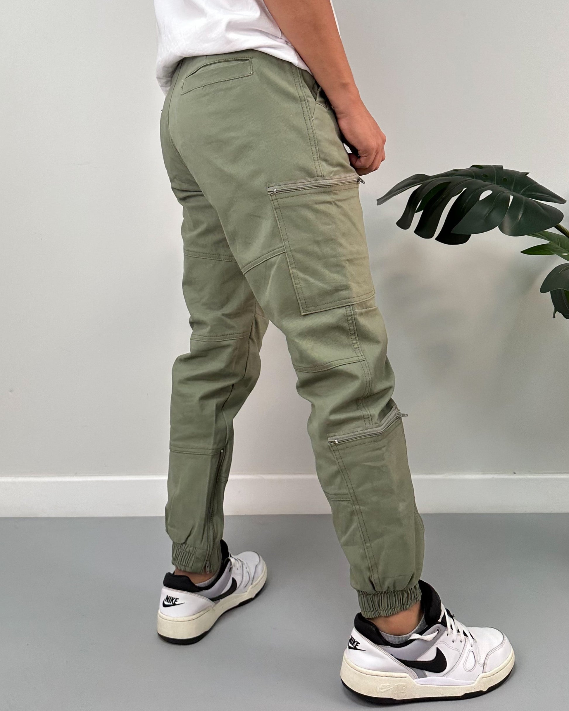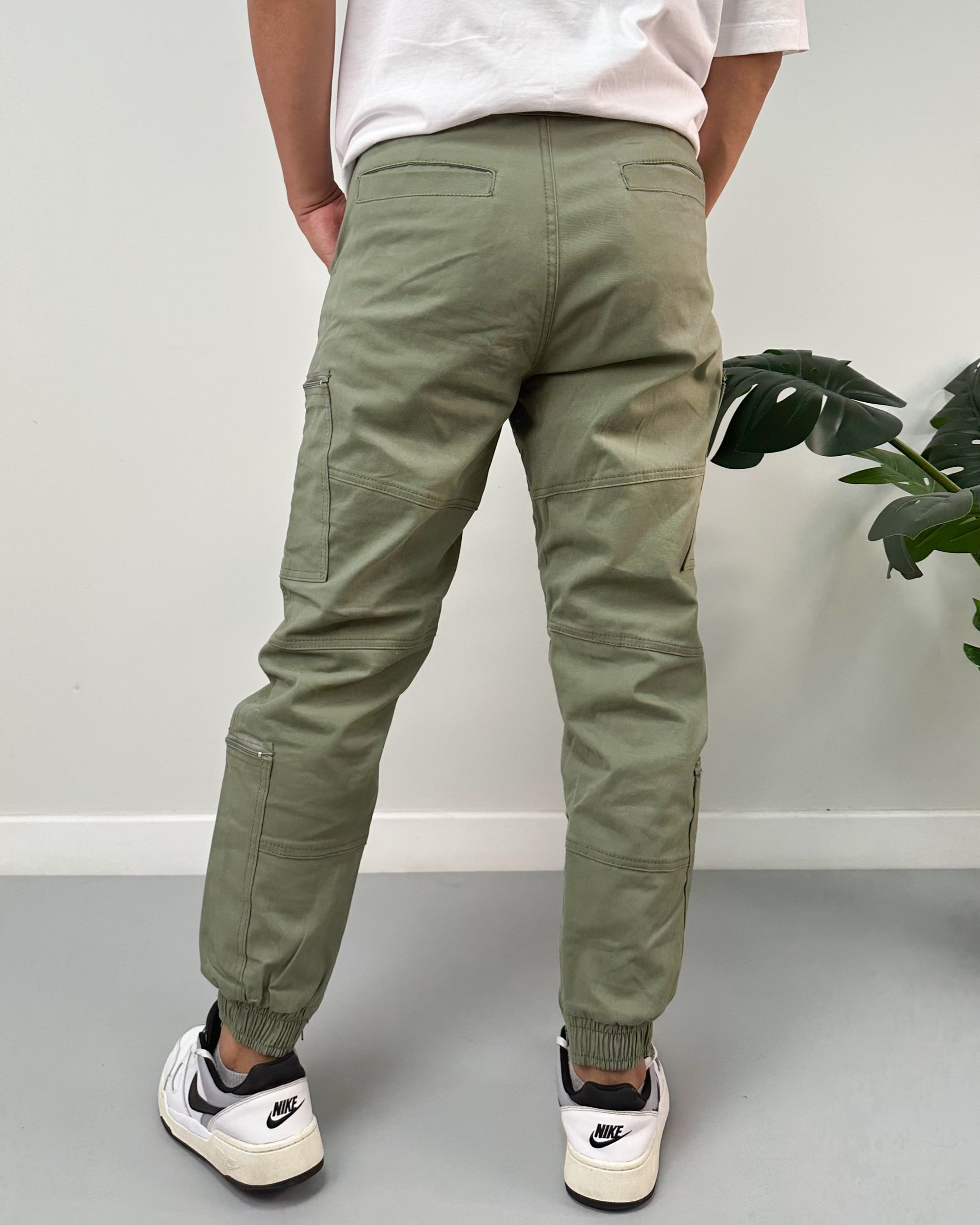 Jogger color negro, verde, kaki, taupe. El modelo utiliza talla 32.