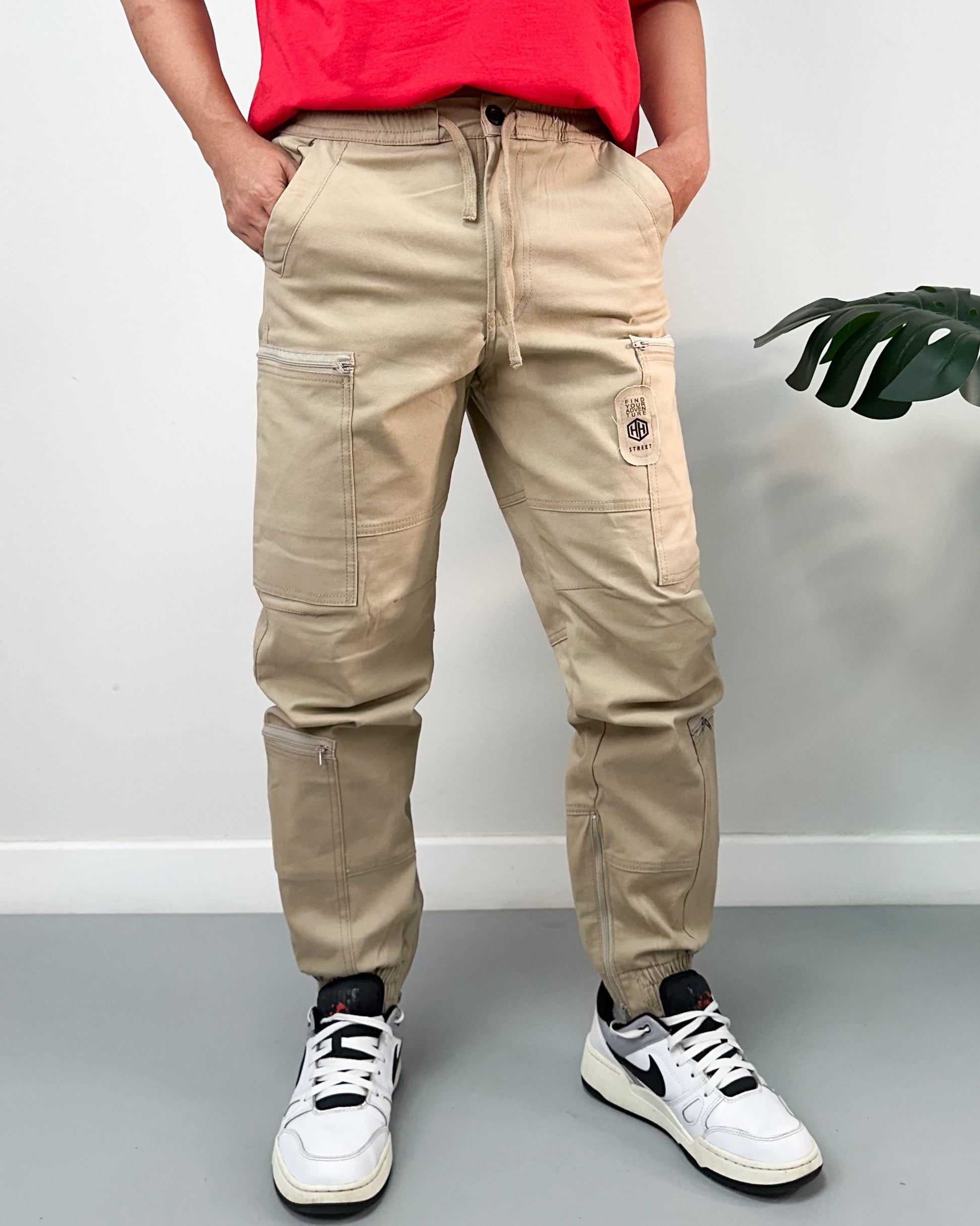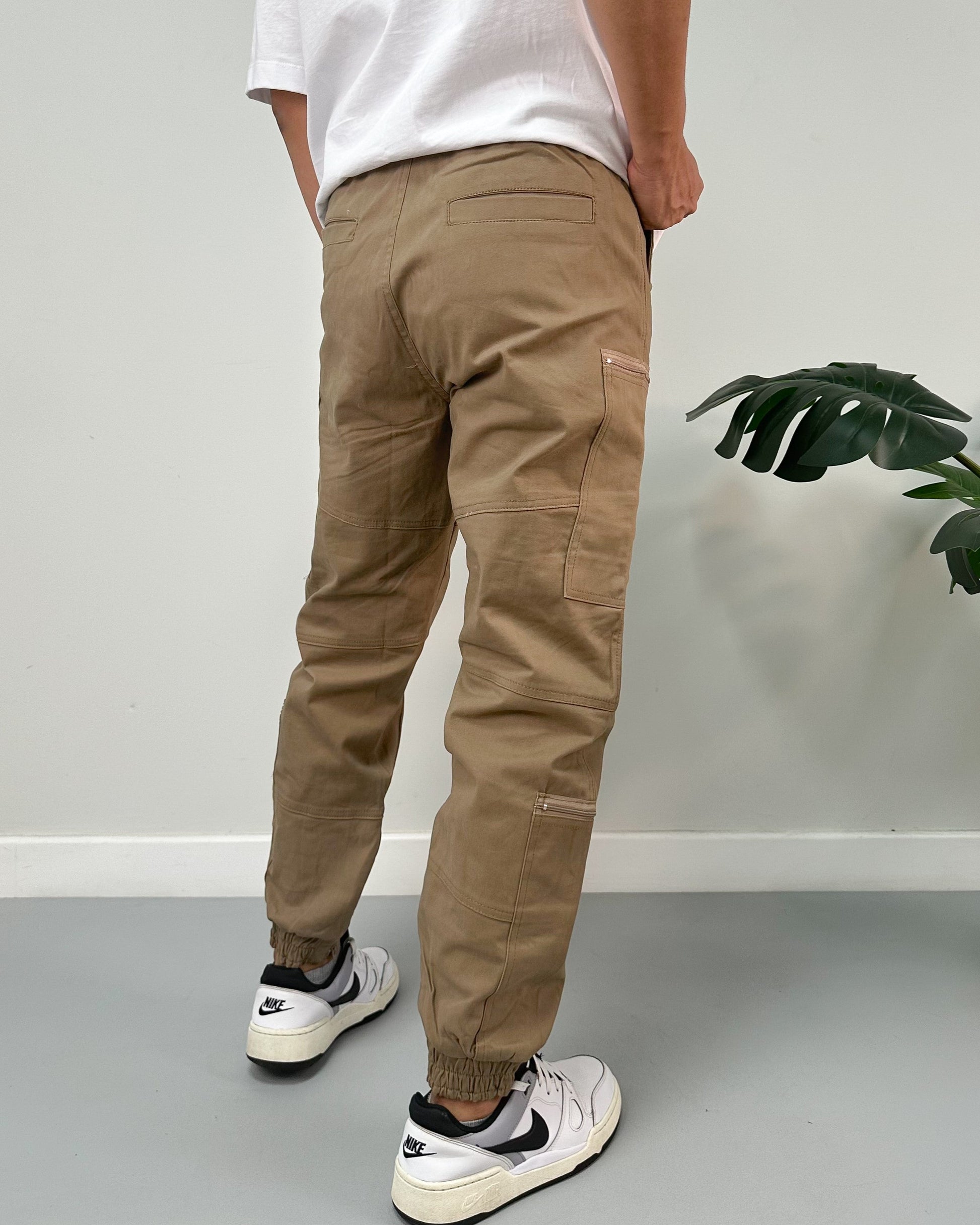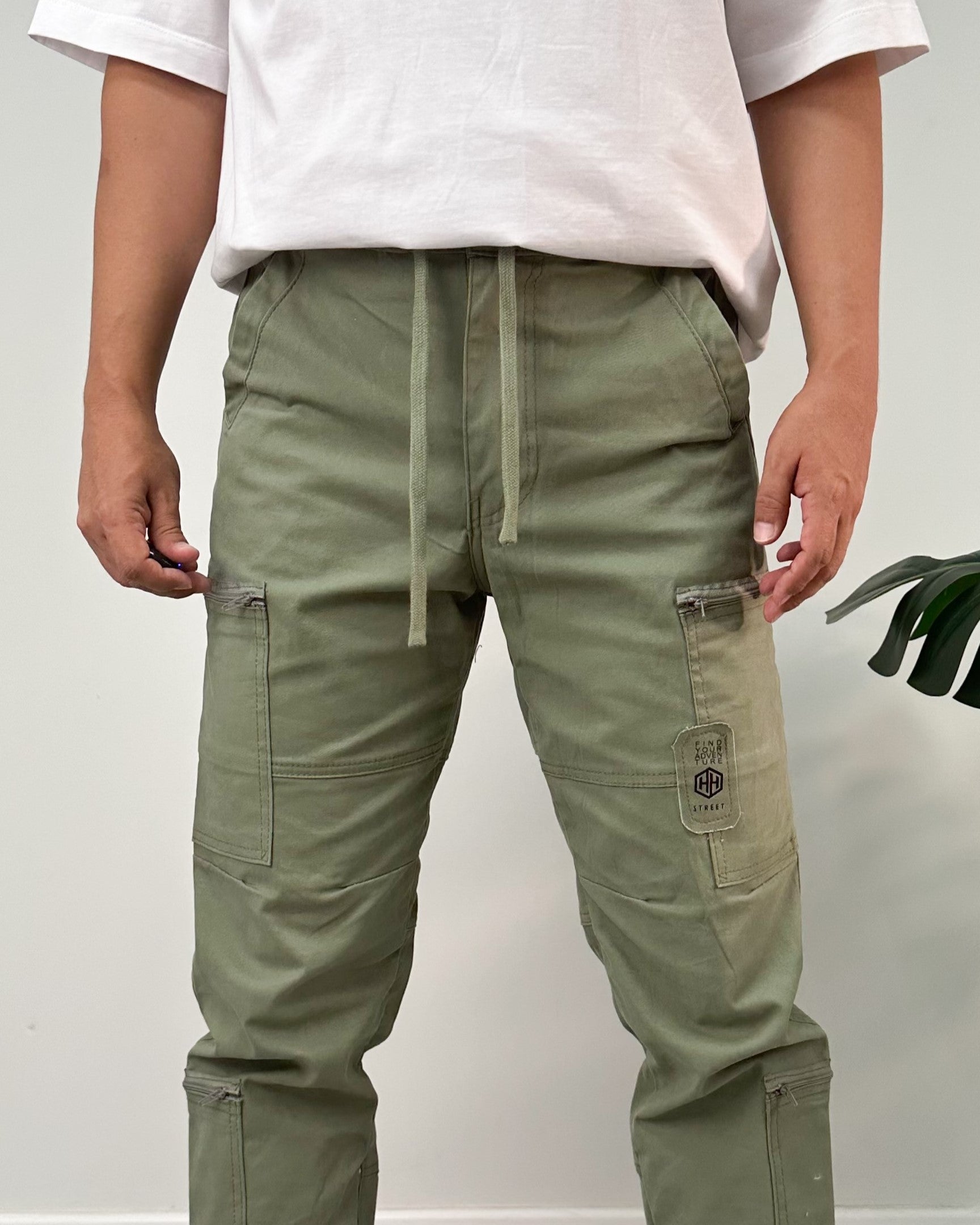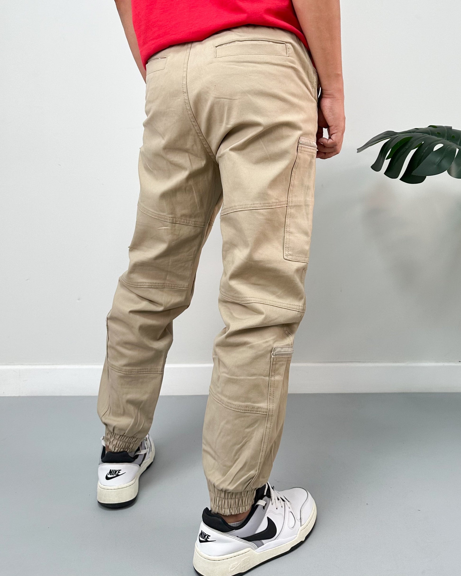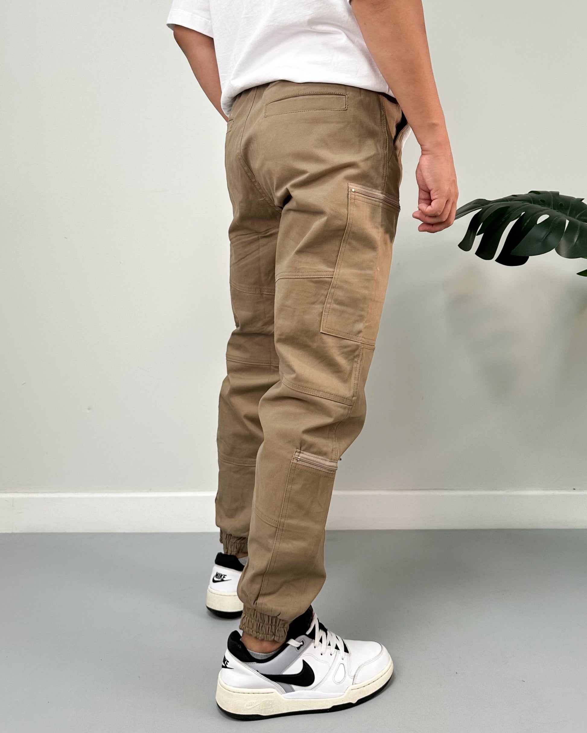 Jogger color negro, verde, kaki, taupe. El modelo utiliza talla 32.