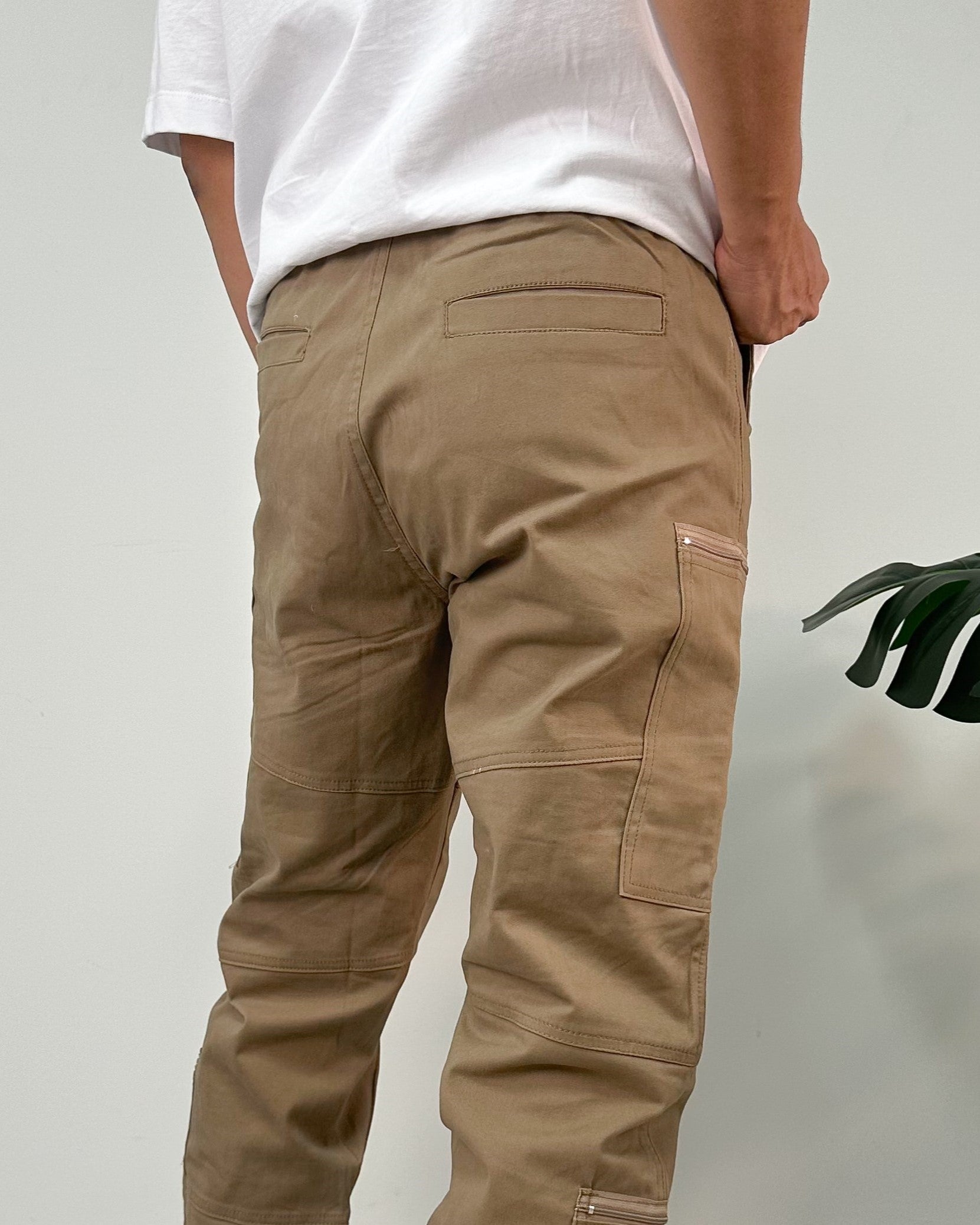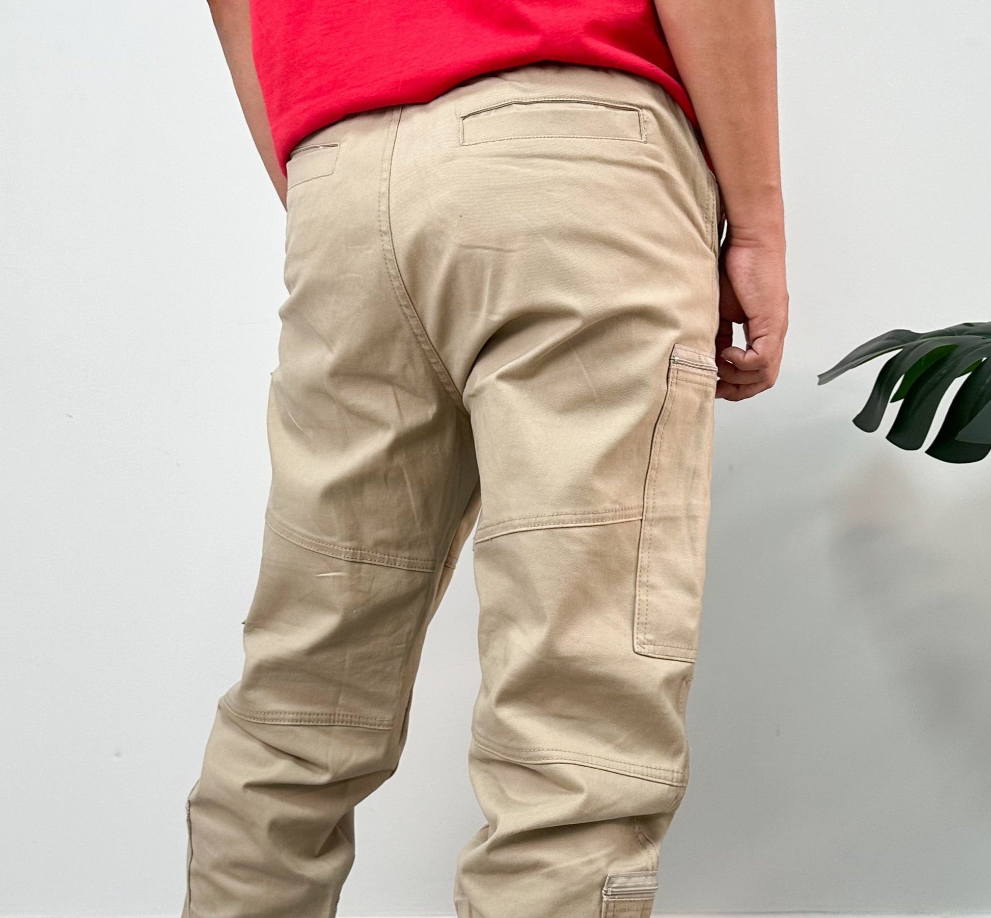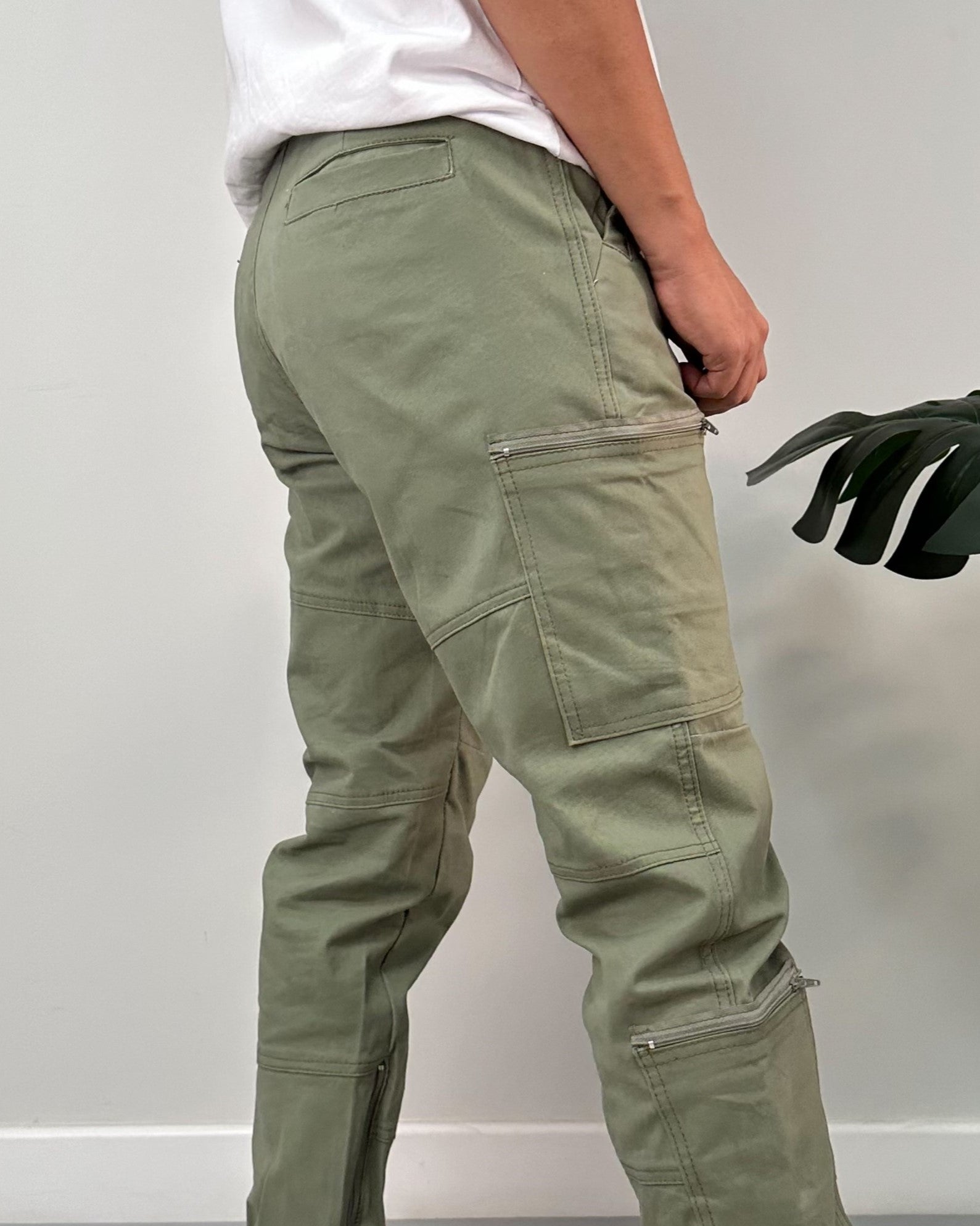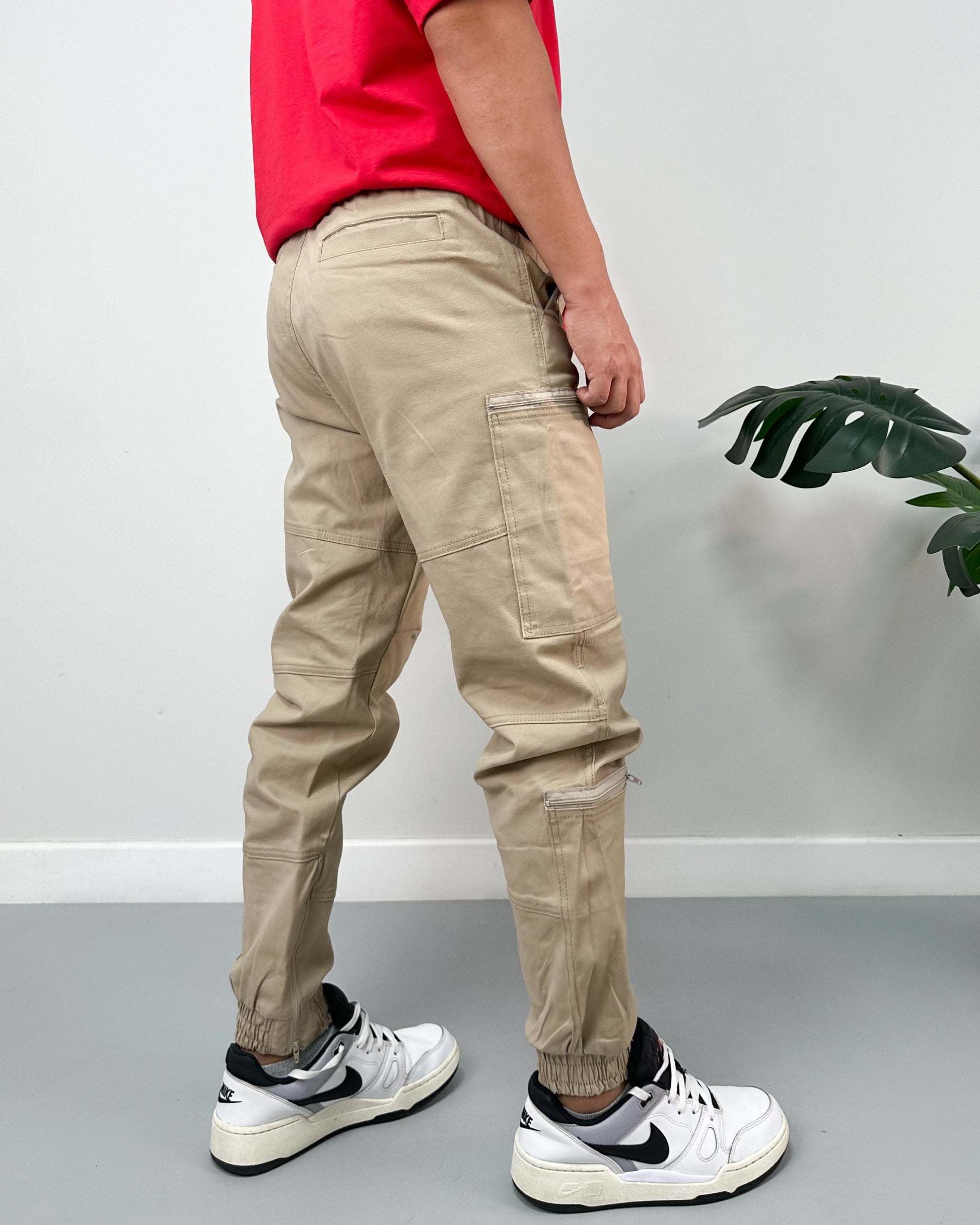Jogger color negro, verde, kaki, taupe. El modelo utiliza talla 32.