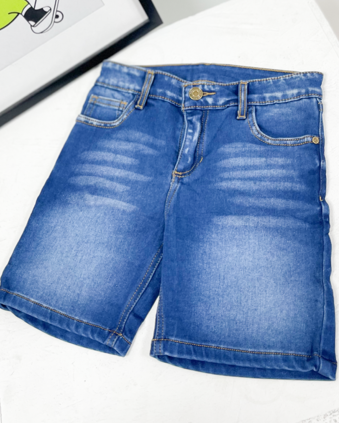 Bermunda Niño azul medio tela strech, con diseño de 5 bolsillos.
