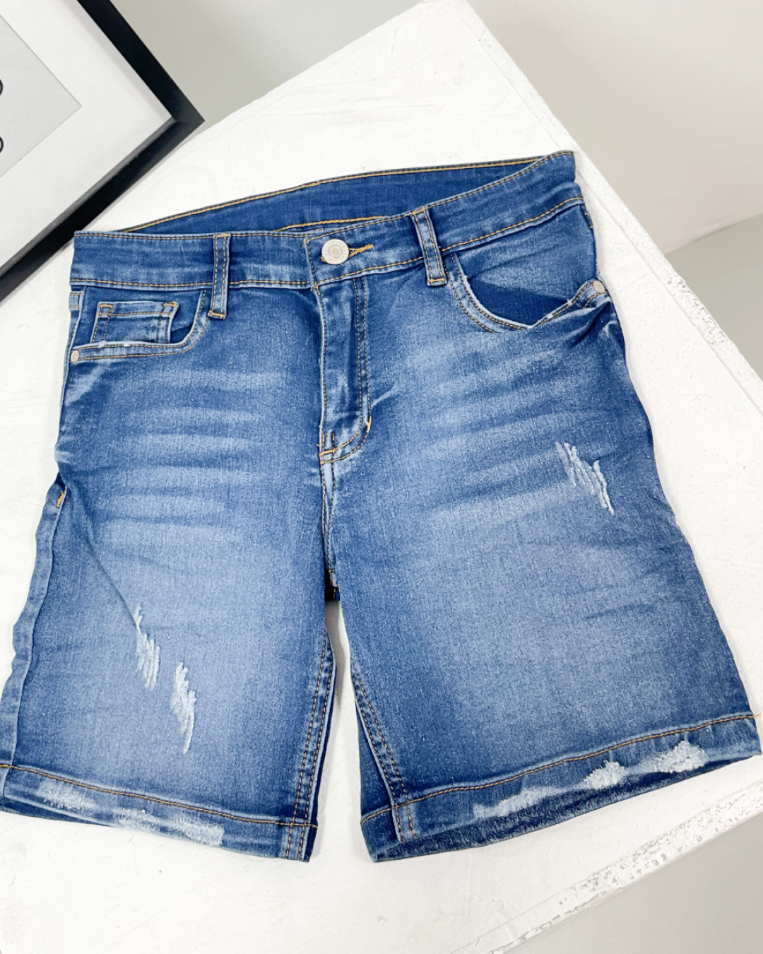 Bermunda Niño azul claro tela strech, con desgastes en la parte delantera.
