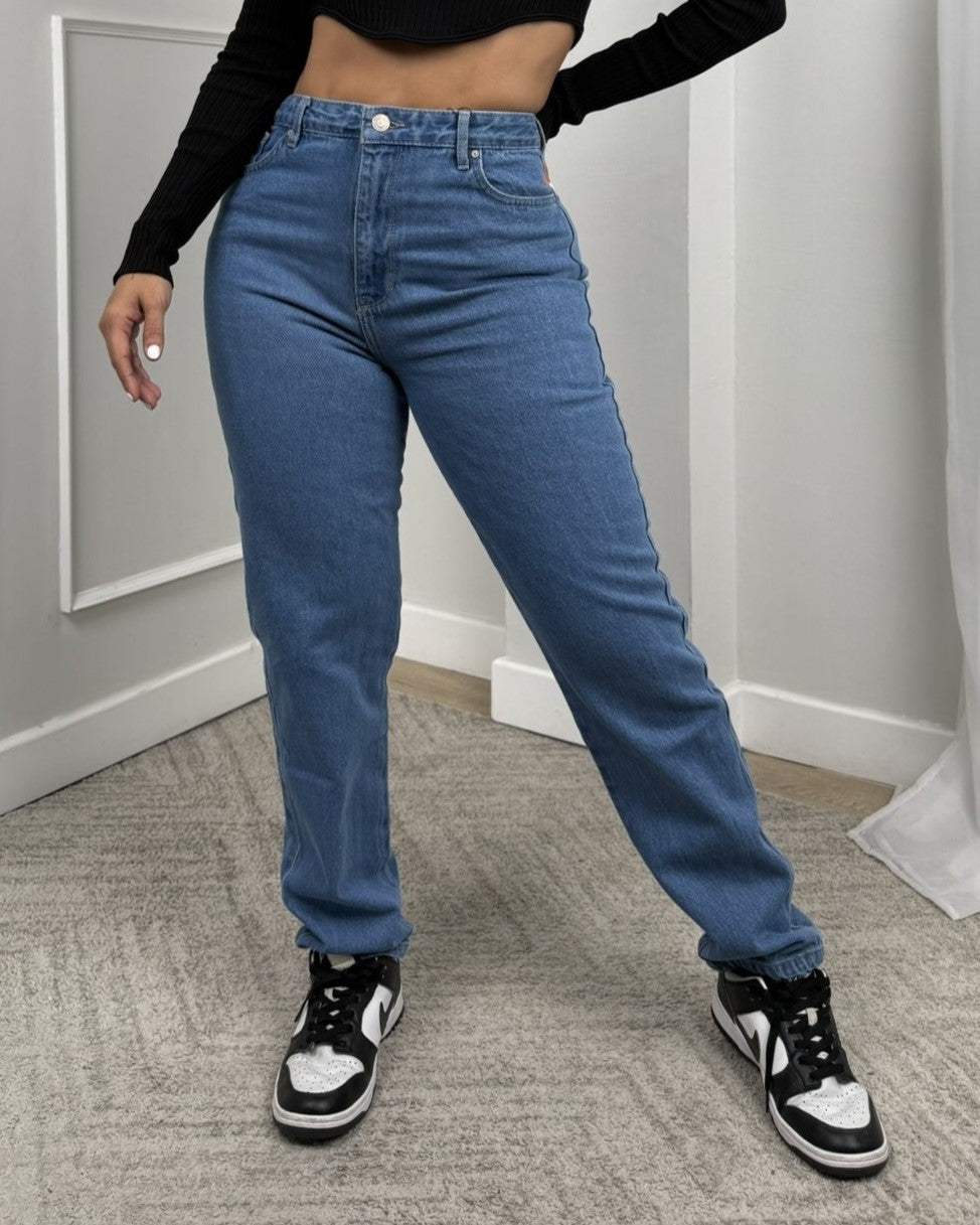 Boyfriend color azul claro. La modelo utiliza talla 10.