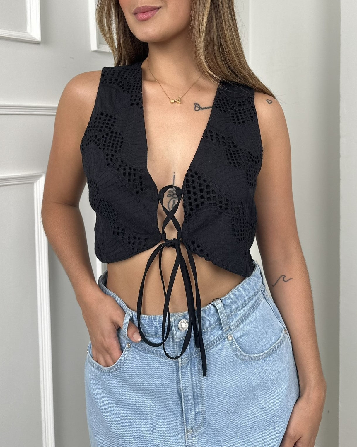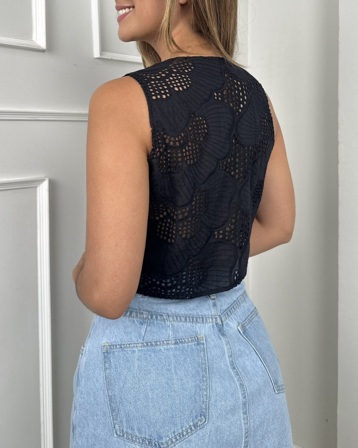 Chaleco de Ojalillo. La modelo utiliza talla M.