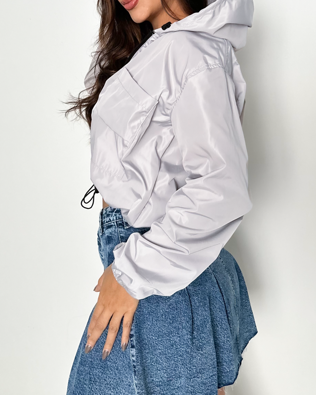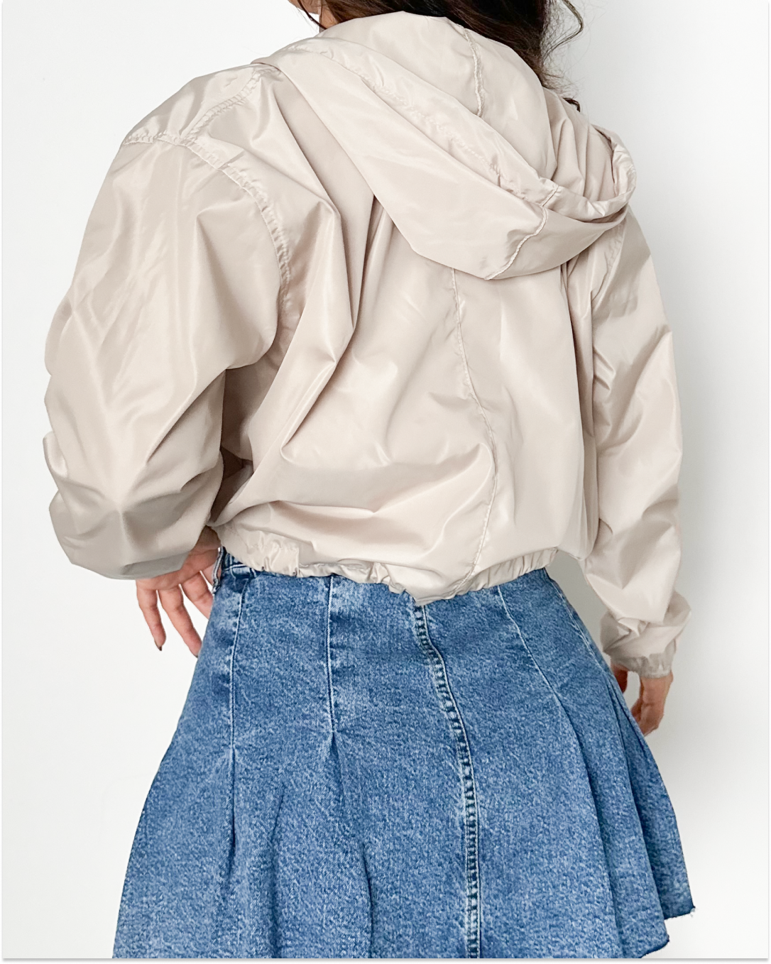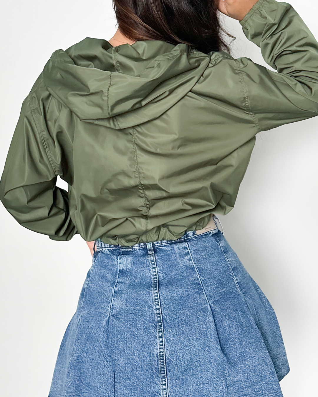 Chaqueta con dos bolsillos delanetros, cierre en la parte delantera. La modelo usa talla L.