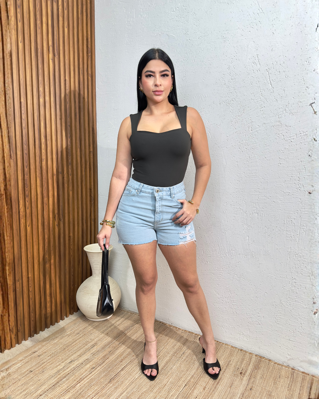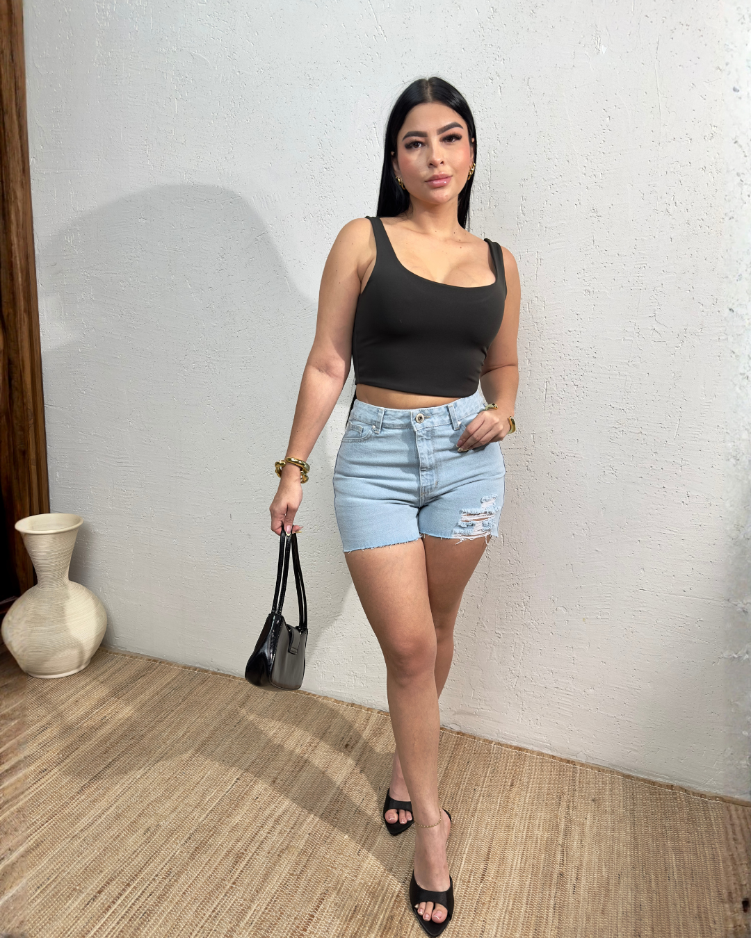Este short está confeccionado en denim rígido de alta calidad, ideal para crear looks casuales y modernos. Su diseño tiro alto estiliza la figura y realza la cintura, mientras que el tono azul claro con leves desgastes le da un toque fresco y versátil para combinar con cualquier prenda.