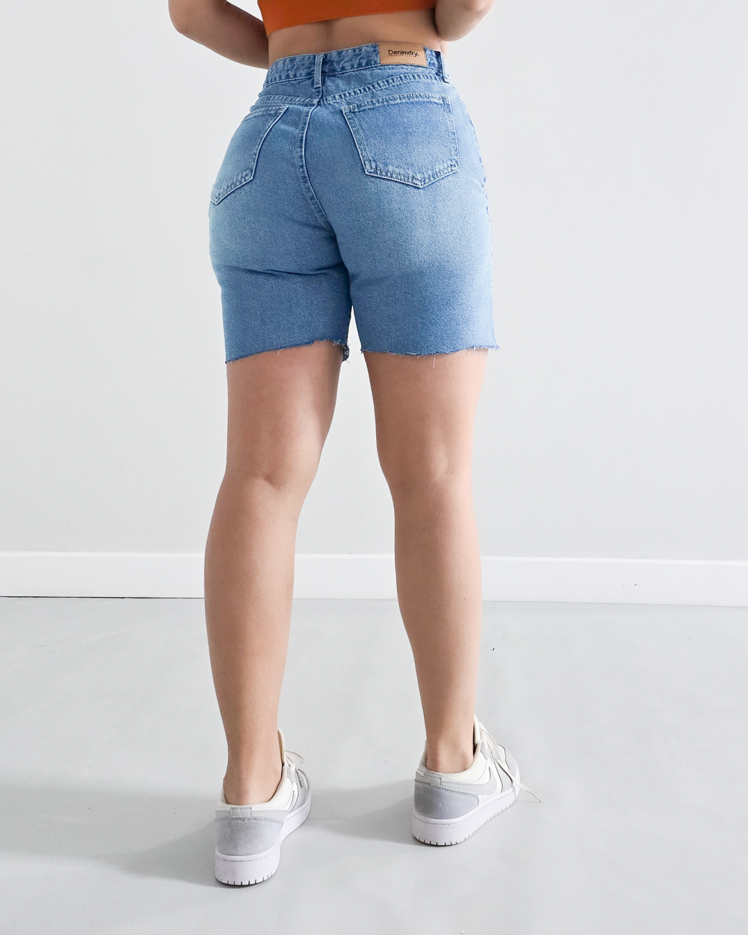 Torero azul medio, tela rigida con desgastes en la parte delan tera. La modelo usa talla 10.